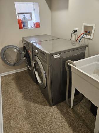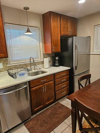 Central heat and AC. Stainless steel appliances including dishwasher in the kitchen. Laminate and tile throughout the unit. There is no carpeting. Backyard patio includes gas and charcoal grills and fire pit.