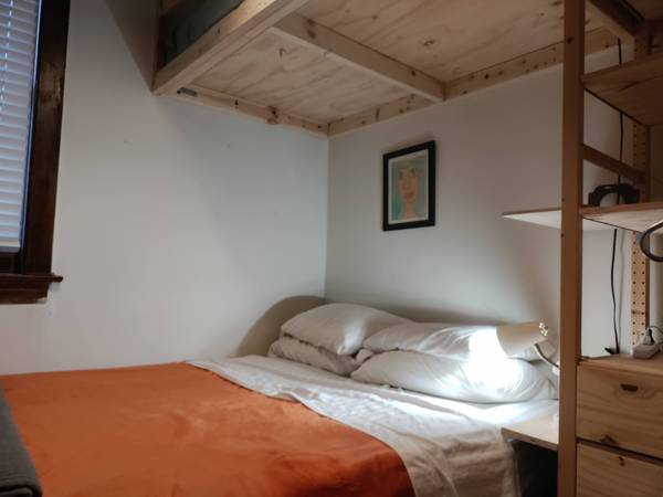 Primary room has queen-sized bed. Second room has double bed, twin loft bed above, and en suite half-bath.