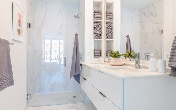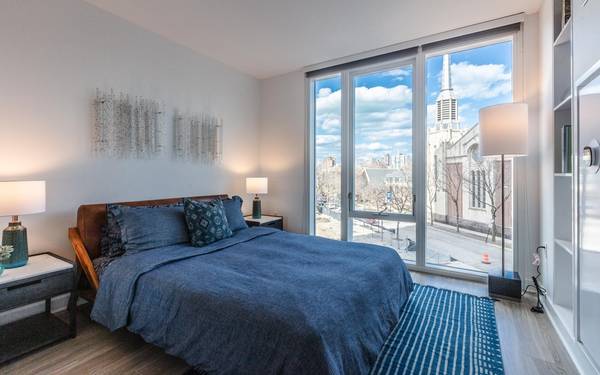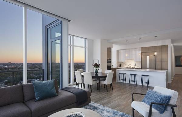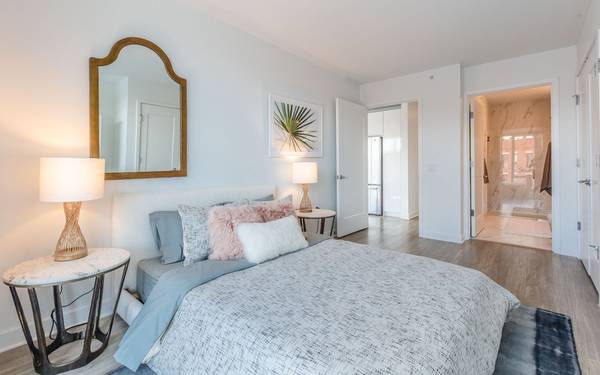 Designed with sophisticated and light details, every apartment is filled with modern luxury finishes. Floor-to-ceiling windows flood sunlight through the open floor plans, complimented by the light gray wide plank wood flooring. Kitchens are outfitted with modern stainless steel appliances, gas oven, quartz countertops, and duo-tone cabinetry. Units also include walk-in closets, full-size in-unit washer/dryer, and smart thermostats. Select units also have a balcony and kitchen island.
