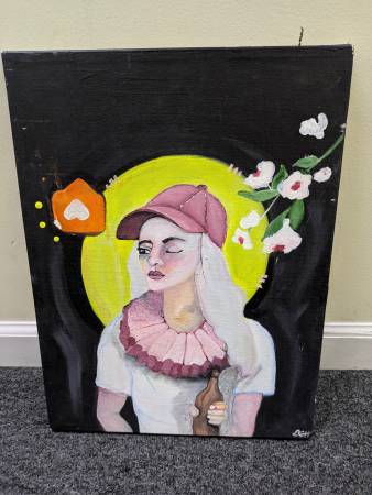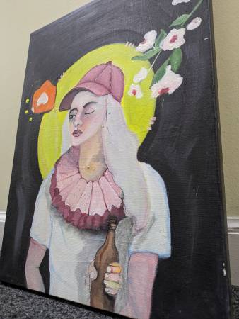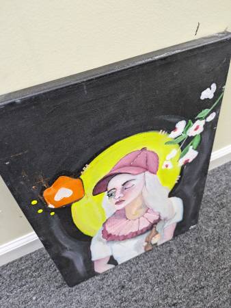 The painting is in excellent condition. It was not created by me. The images show the details of the painting. It is on canvas. The last picture shows the back for hanging. 16" by 15" Payment; Zelle...