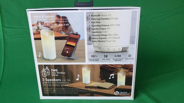 Create the perfect ambiance with this 2-Pack of Lifestyle Advanced True Wireless Stereo LED Candle Bluetooth Speakers. These speakers seamlessly pair together and can connect via Bluetooth to your phone or tablet for a surround sound stereo effect. Forget flat-wick fake candles that only look good from the front, these Wireless Candle Speakers are believable from every angle! Featuring extra thick real wax pillars and a large warm-white flame that flickers and sways - never yellow, orange or dull. Rechargeable so you can use indoors or outdoors to set the mood for any occasion.
