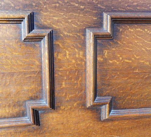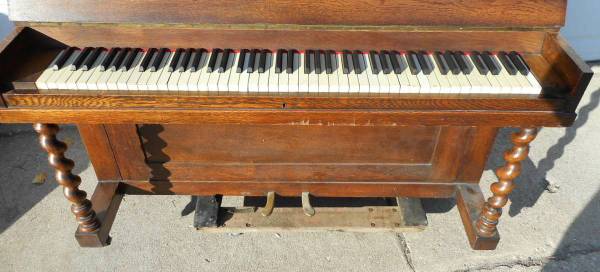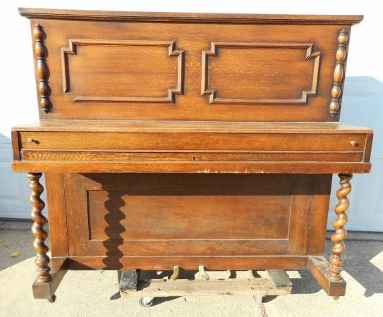 Antique oak Empire style piano is 56" long, 22 ¾" wide and 47" high without the wheels (one wheel is missing). The only marking I could find is a faded paper label and the embossed numbers 10308