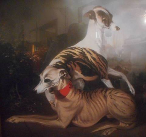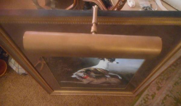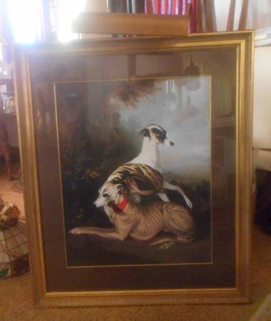 High quality print of two Greyhound dogs framed by Contempo Arts Limited of Clemmons, North Carolina is 32 5/8" by 38 ¾" and has an attached light at the top.