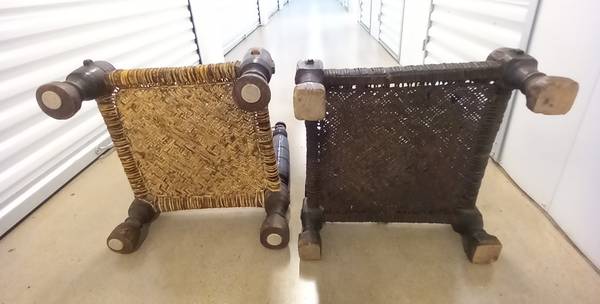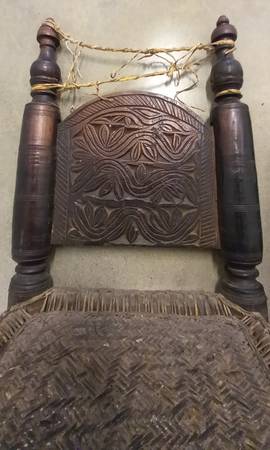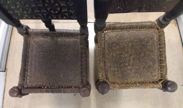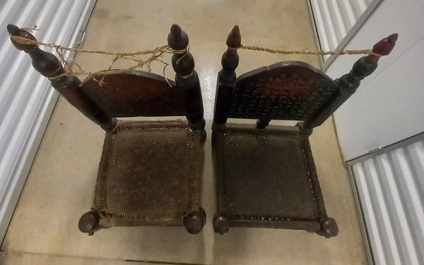 Very old Buddhist tea table with two seats is hand carved.