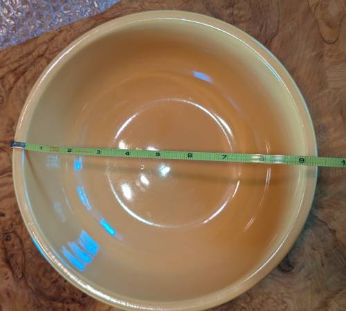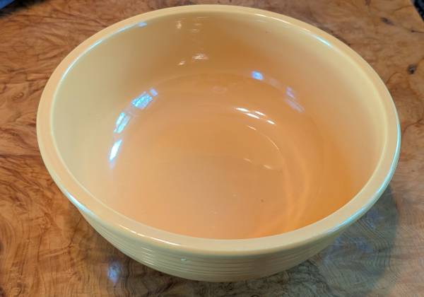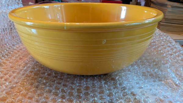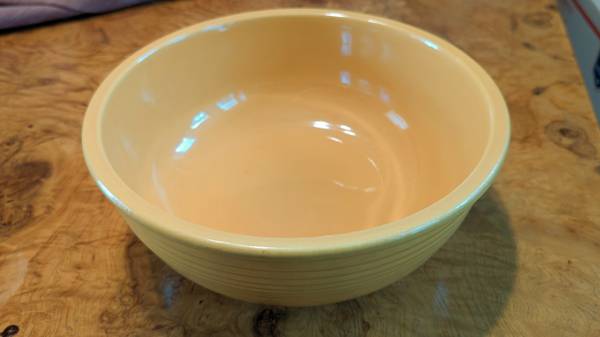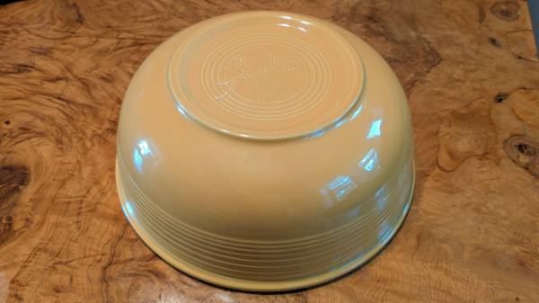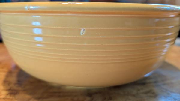 Vintage Homer Laughlin 1940-1943 FIESTA WARE Yellow Promotional Unlisted Salad Bowl. No chips or cracks. Has 3 saggar pin marks which correspond to where it was sitting where it was fired, but this is normal to the bowl and part of how one identifies it (see 2nd and 3rd photo).