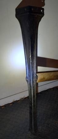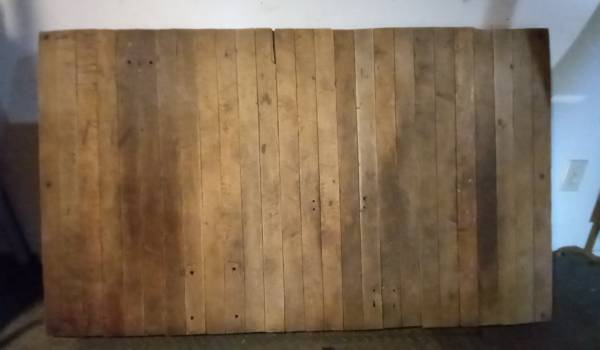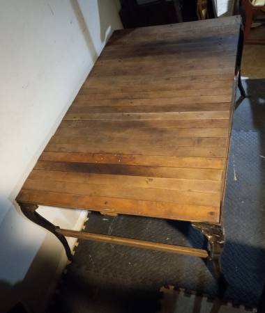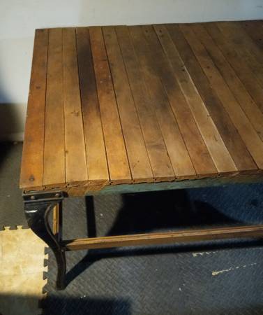 Primitive wood table with iron legs. The top is 35” by 59 ½” and is 27“ high. We presently only accept cash, Zelle and the Cash App.
