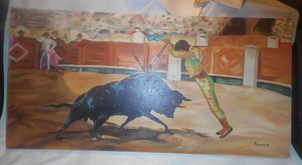 Unframed oil painting on canvas of a Bullfighter signed Rozzie is 15 ¾” by 31 ½”
