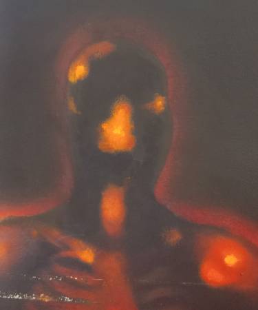 Original unsigned red silhouette oil on canvas from the estate of unknown outsider artist Grant Gilbert is 48” by 66”. Has some damage to the paint as can be seen in the pictures.
