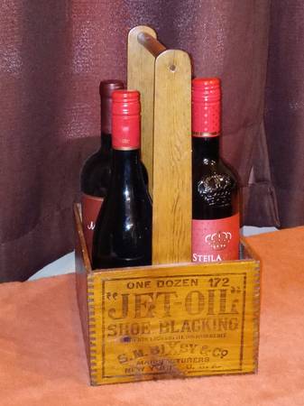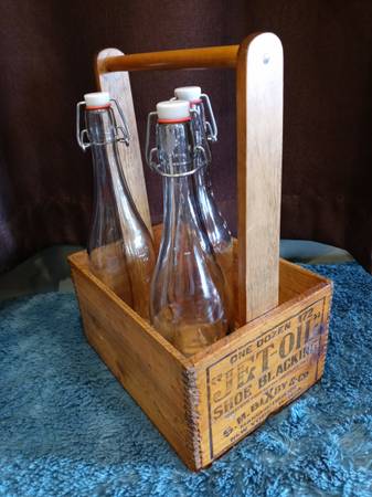 Beautiful vintage wooden caddy with 3 glass bottles. 7.5"×10"×14"H. Local pick up. Cash.