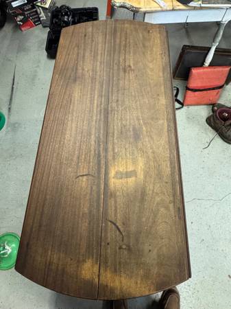 Drop leaf table only has one drop leaf. 312 next 802 next 6002. 21”x 48” with leaf down. 48” x for 34” with leaf up. 30” high
