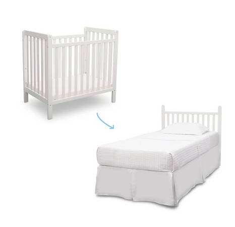 The Classic Mini Crib with Mattress Convertible to Twin Bed from Delta Children has the same style, safety features and craftsmanship as any full-size crib, just in a scaled-down size. Designed for urban spaces, smaller nurseries or as a spare crib for grandma and grandpa's house, this versatile crib includes a crib mattress, and features two adjustable mattress positions that allow you to lower the mattress height as baby grows. Extending its value well past the nursery, the Mini Classic Crib with Mattress from Delta Children converts into a twin bed when the time is right (metal bed frame sold separately).