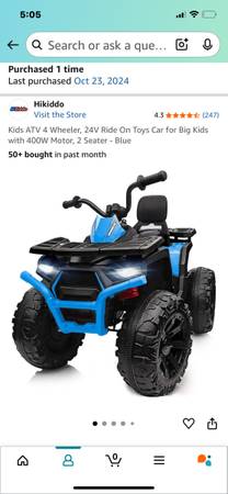 In great condition comes with charger. Hikiddo ATV 24w ride on toy 400w motor. Brand new $400 asking $120. If interested email or text 773-6oo-706o