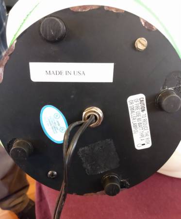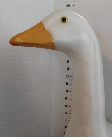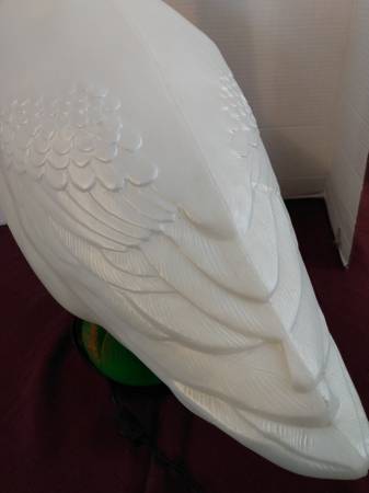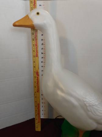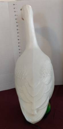 Pre-owned. A long neck goose, 24" tall, that plugs in for a night-light or nursery lamp. She's decorative and resembles Mother-Goose, a favorite well-know character related to children's nursery-rhymes. Made of plastic having a white body with a lite pearl-like finish and detailed embossed feathers.