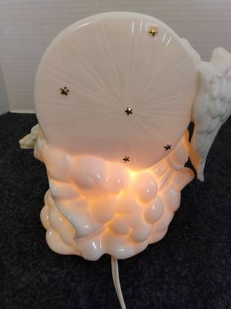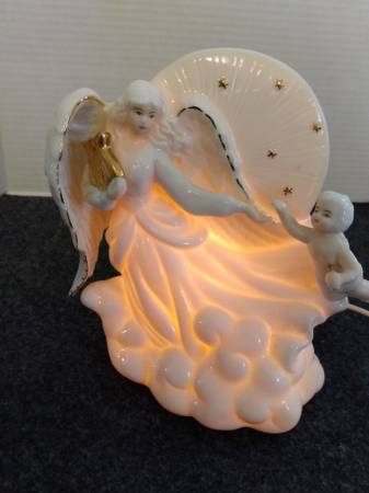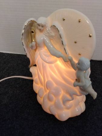 Pre-owned, ceramic, corded nightlight of a Angel and Cherub. Cherub missing a tiny wing yet barely noticeable; price is reflective and reduced. Cash price $13.00 Please bring exact change. Thank you.