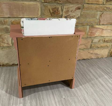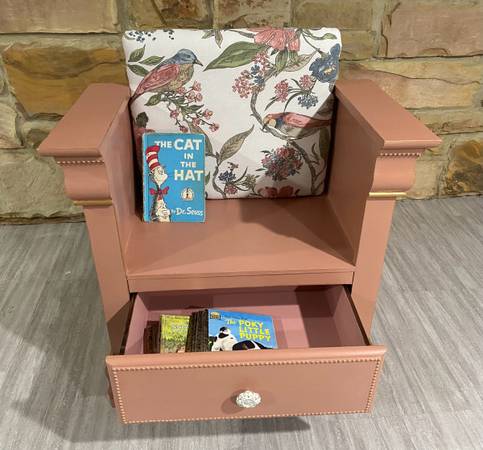 Toddler’s chair with storage. A night stand turned into an adorable child’s reading chair. Painted pink with gold accents 28” wide x 17” deep x 32” tall Pickup by Forest Pl & Bernard Dr Buffalo...