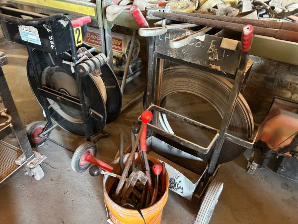 (1) Signode model df-15 dispenser (1) U-Line STRAPPING CART High Tension Steel Strapping Banding Tool Crimper Band Strap Clip. More pics coming soon.