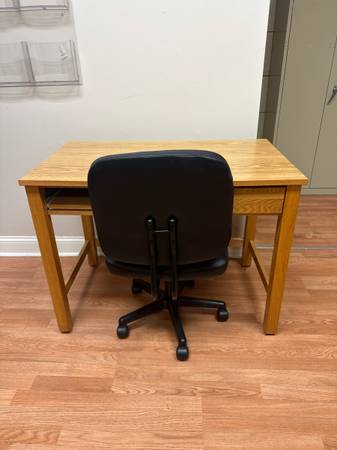 Selling a wooden desk paired with a comfortable black office chair. This set is perfect for a home office or study space. The desk features a pull-out keyboard tray and a drawer for storage. The chair is adjustable for optimal comfort during long work sessions. 40 inches wide 24 inches deep 29 1/2 inches high.