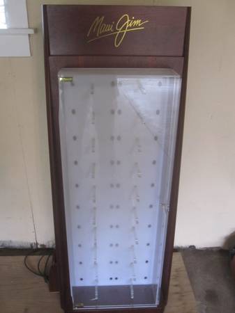 Offered is this cool Maui Jim sunglass display case in good shape. This revolves and is lighted which works. There is a little wear to the wood and a piece of the plexiglass which is broken but have the piece to repair it. This does have several locks to which there are keys