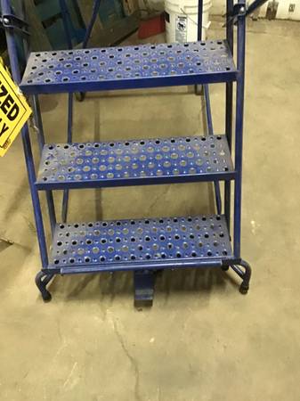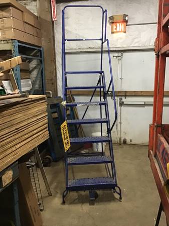 7 Step Rolling Ladder Overall Dims 32” W x 107” H x 56” L 67” H Platform / 24” W Steps / 7” Deep Steps 10” Deep Platform Manufactured by Tri Arc Manufacturing Made in America Nice Blue Color...