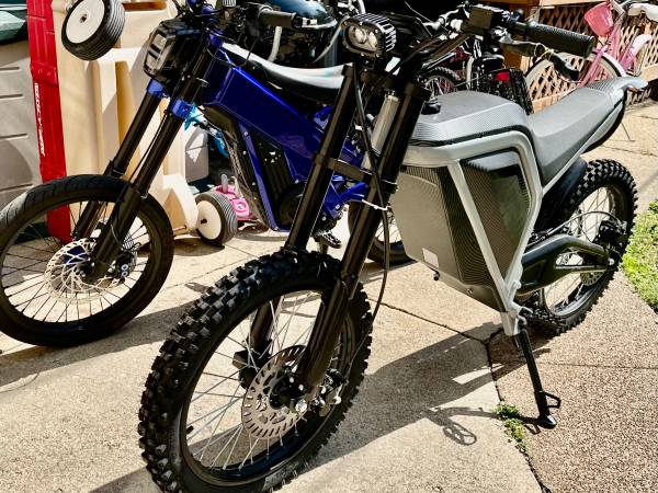Pictured is my personal bike. 4500W peak. Brand new electric bike / e-moto in a sealed metal shipping crate, never used and never assembled (I can assemble it for you if needed). This bike has a powerful mid-drive motor with 2500 W continuous and 4500 W peak power, reaching speeds up to 45 mph once original controller is reprogrammed (closer to 50 mph with a Fardriver controller) and offering up to 45 miles of range on a full charge. I was able to get from Elmwood park to Alsip (25 mile run) no problem going over 30 mph entire route. It comes with a 5A fast charger that fully charges in about 6 hours. Built with heavy-duty thick spokes thicker than on talaria 3x, a wider and more comfortable seat compared to other electric bikes, and a legit motorcycle-style headset, this bike can take hard beating. It’s comparable to the Talaria XXX and Sur-Ron but available for a lot less in Chicago. They also go by Valtinsu and Valnitsu. Cash only, no trades unless it’s 250cc and up 2010+ model or electric 60V and up mid drive only. All REASONABLE offers will be considered
