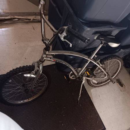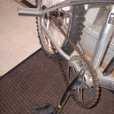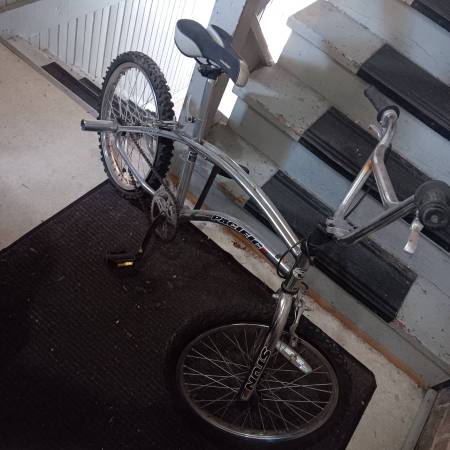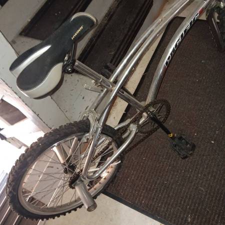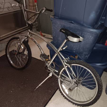 Needs nothing .Frame , handlebars and front forks are chrome.Unique strong double backbone frame.Non - slip grip type peddles. Free style sprocket on rear wheel.Foot pegs on rear axles .Good working hand brakes .Qwik adjustable seat .Bike is in excellent shape.