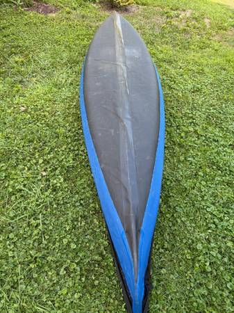 Puffin Saco kayak with deck from Pakboat. 12.5' long and weighs just 20 pounds. Has seen only modest use and is in good condition. Side air tubes hold air, as does the inflatable seat. The skin is in very good condition--only two small patches on the bottom. Assembles in about 20 minutes; disassembled it fits in a small duffle bag for easy storage or transport. Comes with air pump and small repair kit. New and with the optional deck this kayak costs $1,650. Located in Hyde Park, but it can be shipped.