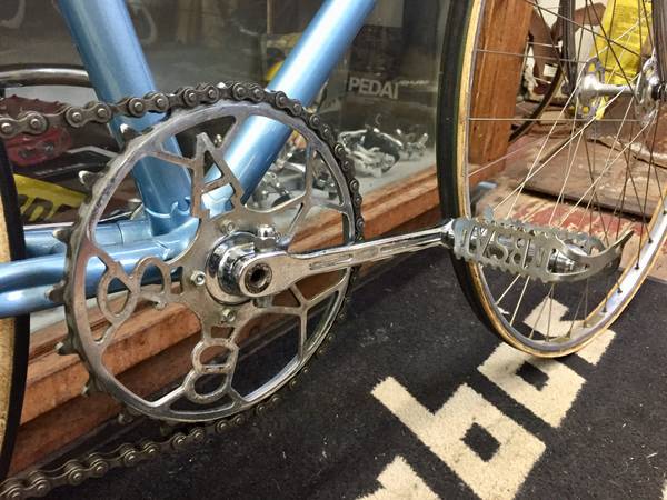 Lugged (Nervex?) chromoly frame and fork in excellent condition with few signs of use, 22 x 9 skip-tooth fixed gear drivetrain, Stronglight cottered cranks, BSA pantograph chainring and pedals, Airlite rear flip flop hub, Campagnolo Record front hub (not period correct), Fiamme Ergal gold label tubular rims, Universal brake, Ideale 2001 saddle.