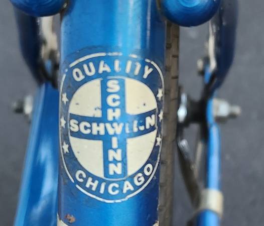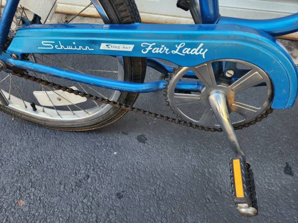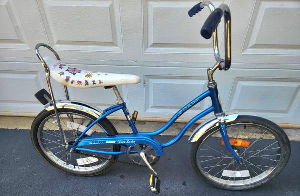 1978 Schwinn Fair Lady/Sting-Ray, Made in Chicago, Sky Blue in color, chrome is in great shape, tires hold air but will need to be replaced in the future, single speed , coaster brake, one small tear in Schwinn floral design banana seat, Schwinn blue sparkle hand grips, built in kickstand. Located in Marengo, 60152.