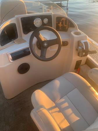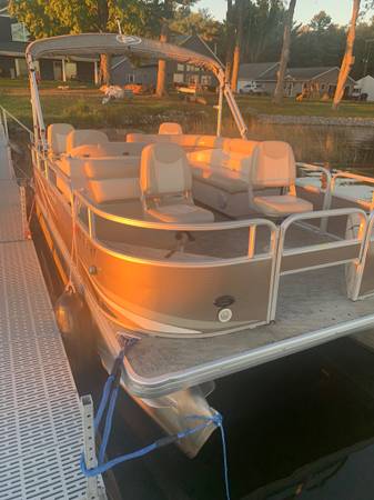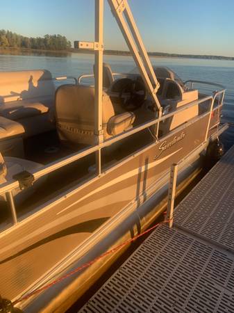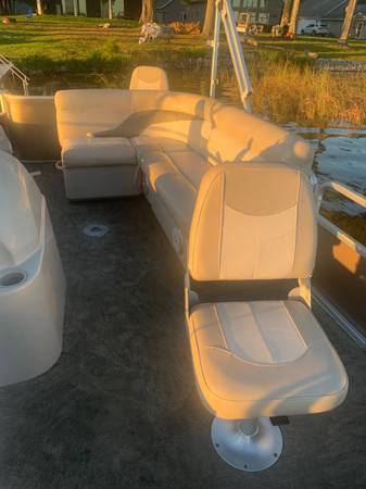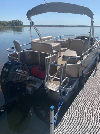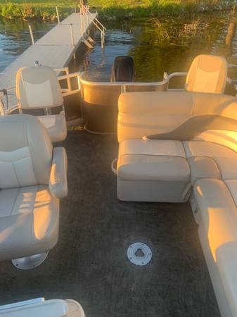 2011, 18’ fishing pontoon boat, 60hp Mercury motor (new 2023). Runs great, quiet, & low hours. Duel fishing chairs, live well, removable pedestal table. Versatile layout. Set up for 24 volt...