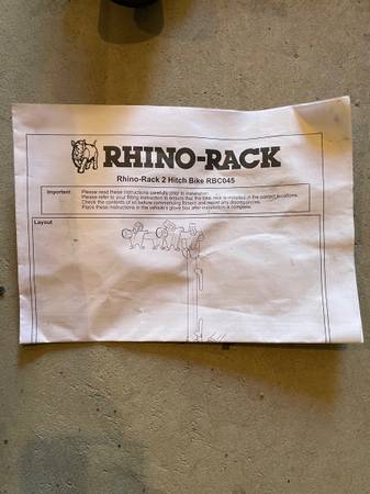 Brand new- never used bike rack. Rhino-Rack model RBC045. Retails for over $200. Please confirm fit to your vehicle. Buyer must pick up. Hitch NOT included. See pictures for items included.