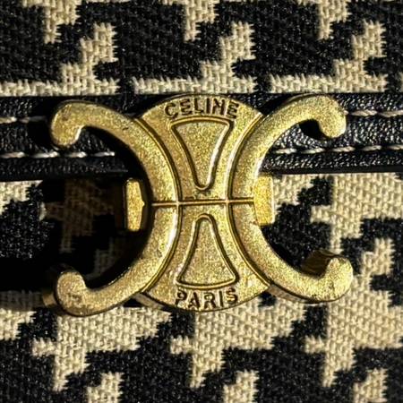Celine's monogram/houndstooth pattern and an adjustable crossbody strap. Features leather trim and a hidden slot to keep your ID or credit card. Metallic gold Celine logo button for opening and...
