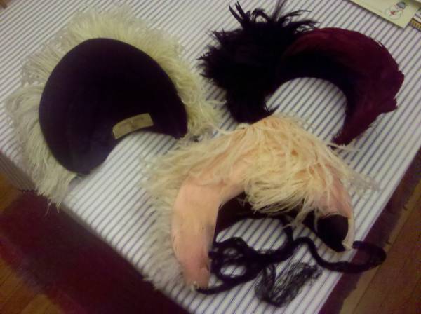 Fur collars $25 each, add to your coat, jacket, or sweater. Dark grey sheepskin coat with furry inside runs extra small $200. Sheepskin natural color medium jacket $200. Three quarter length French rabbit coat fits small or medium $200. White fabric fringed triangular shawl $20. Light blue satin rectangular wrap $20. Knit hats $20 each. Straw boater hats $45 each. Ladies vintage hats and bonnets priced individually. Ladies assorted hats from $15 UP each. Fur hats $50 each. Fake fur black hat $25 shown in the last two photos of furry hats and can be worn either way. Vintage leather travel bag needs new zipper $50. Shoes, boots..