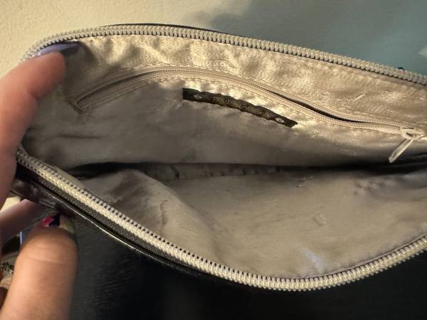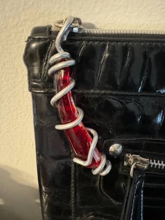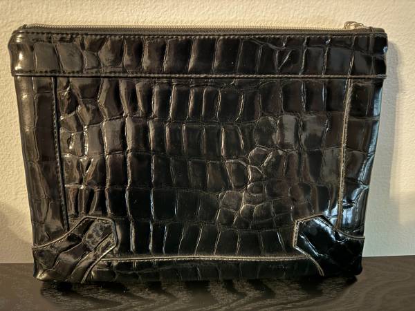 In good condition with a clean interior. Glossy black clutch with metal buckle details and an external small zipper pocket. Main zipper has an interesting wire-wrapped red and clear resin accent....