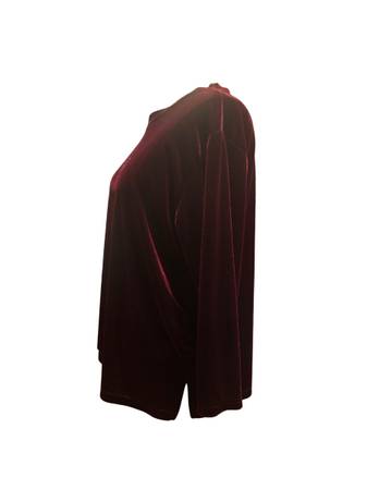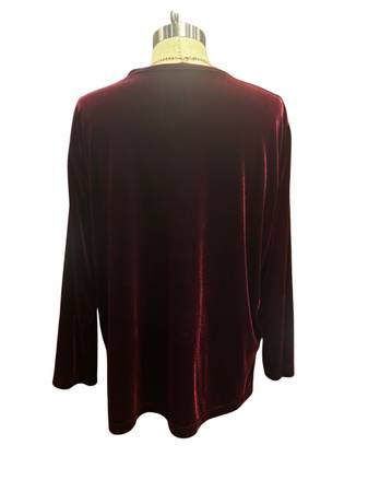 The Women's Burgundy Velvet Top wt0025 is a plus-size tank top designed for women who wear a 2XL. Made from luxurious velvet fabric in a rich burgundy color, this top offers both style and comfort for any occasion. Perfect for adding a touch of elegance to any outfit, this top is a versatile addition to any woman's wardrobe. 46 chest 19 sleeve 17 shoulder 24 length.