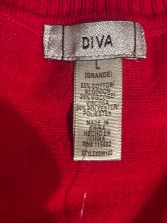 The product is a women's tight hot pink sweater by the brand Diva. It is a size L with a regular fit, designed as a pullover style sweater. The bright pink color adds a bold and stylish touch to any outfit, making it a fashionable choice for women looking to make a statement with their clothing. 55% cotton 25% viscose 20% polyester. 27 sleeves 13 shoulder 33 chest 26.5 length. Very soft. Brand new without tag.