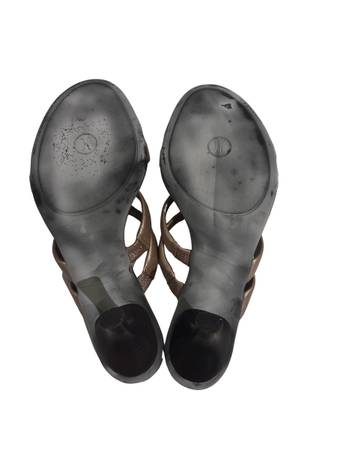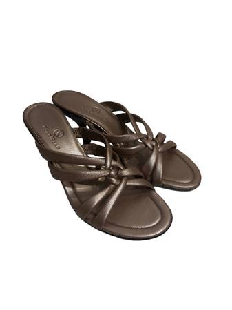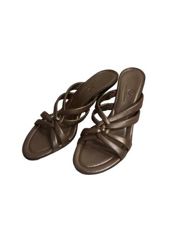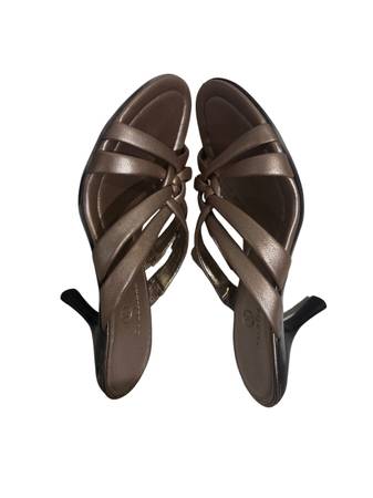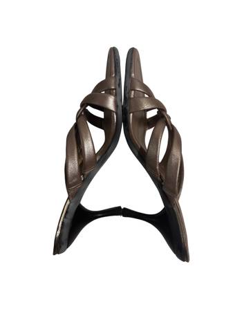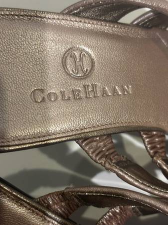The Cole Han Women’s Wedge Sandals.wf1022 are stylish slide sandals designed for women in a bronze pink color with a wedge heel. Made of faux leather, these sandals from Cole Haan feature a comfortable fit in a US shoe size 7. The stylish design and quality materials make these sandals a versatile and fashionable option for any woman's wardrobe. Size 7. 3” heels.