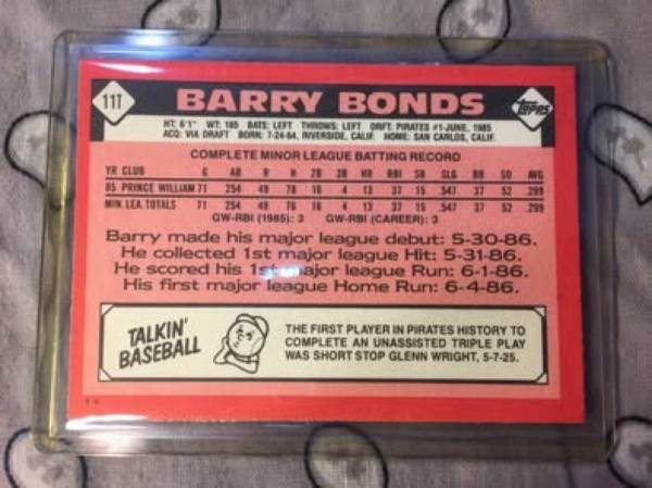1986 Topps #11t BARRY BONDS Traded Rookie Pittsburg Pirates baseball card Excellent condition, not graded. See photos. Stored in soft protective sleeve, inside a high impact, slip-in casing. Serious...