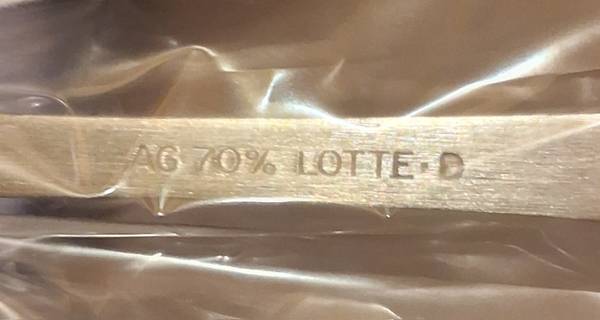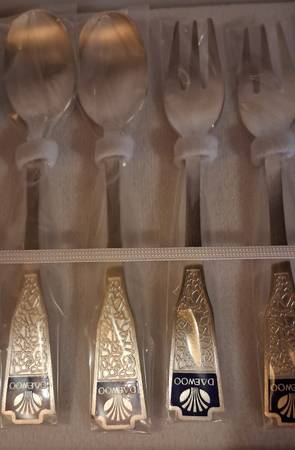 Six spoons are each 5" long and weigh .58 troy ounce. Six forks are 4 13/16" long and weigh .50 troy ounce. Excellent, new condition.