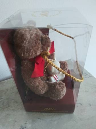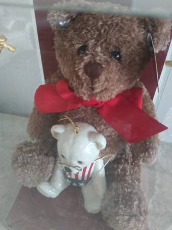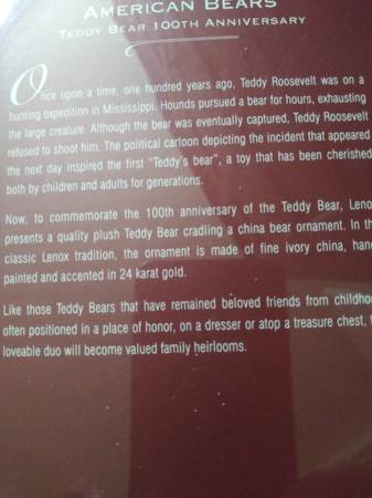 This Lenox Collectable features a plush Teddy Bear and porcelain Teddy Christmas ornament in honor of the 100th Anniversary of the Teddy Bear. Anniversary took place in 2002 a hundred years after the cartoon of Theodore Roosevelt featured with a bear which started the Teddy Bear craze named after the President.