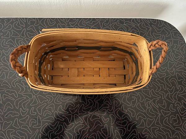 Basket measures 15" x 10" x 5.5" tall. Braided handles on each side. In great condition.