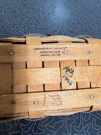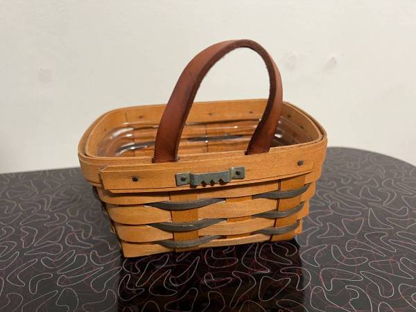 Small basket with hanging bar on the back and a single leather loop handle. Plastic protective liner included. 7" x 5.5" x 3.5" tall (not including handle)