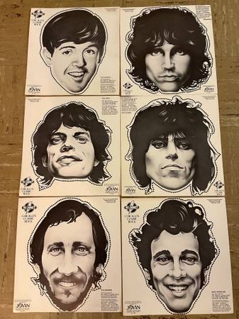 The set includes Mick Jagger, Jim Morrison, Paul McCartney, Pete Townsend, Bruce Springsteen and Keith Richards. Each mask is uncut and on 12'' x 12" card stock. On the back of each Mask is the Rocktober 1981 promotion calendar for the Chicago radio station 95 1/2 WMET. Suitable for framing.