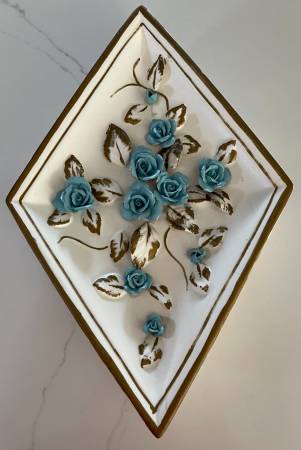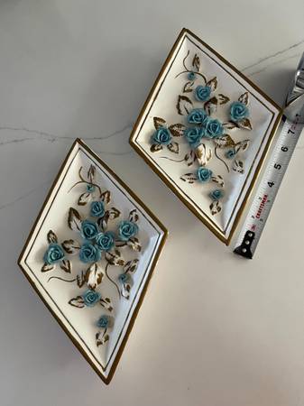 Set of 2: MCM 1950’s / 1960’s Lefton’s Japanese Porcelain Diamond Blue Flowers w/Gold Trim Hanging Wall Art.
