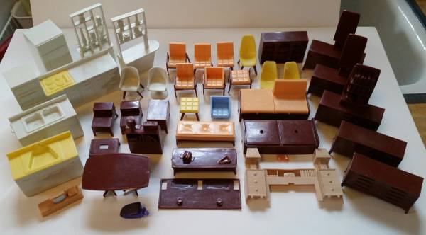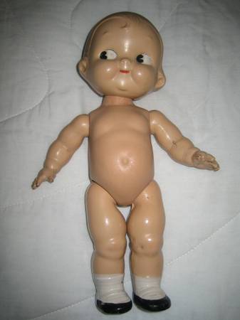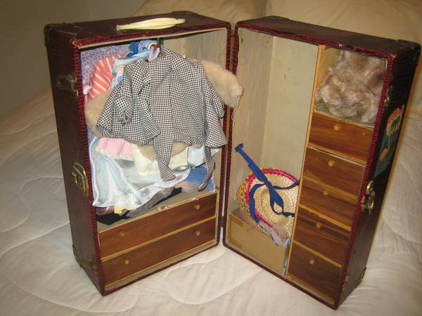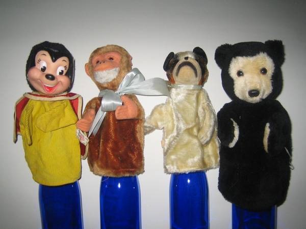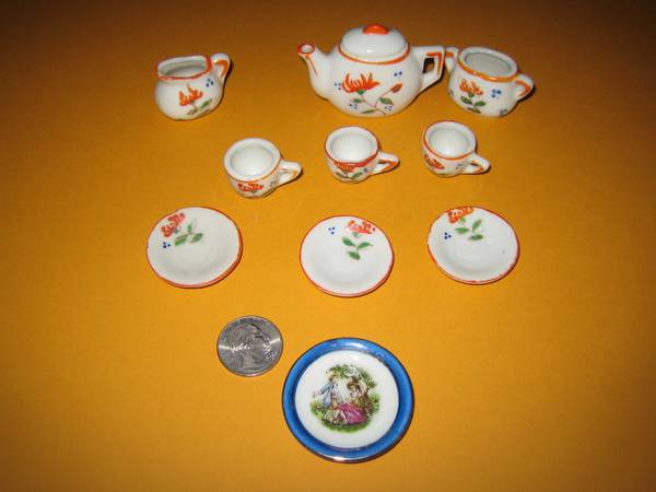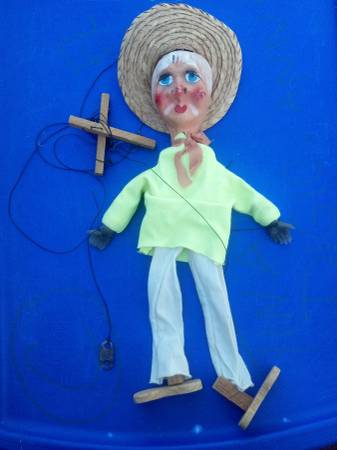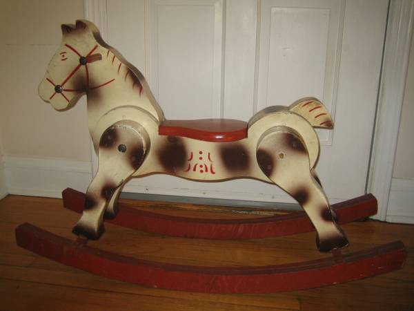 Vintage late forties musical carousel/merry-go-round, plays music, turns slowly, on-off switch, has all characters but needs to have some put back on the floor of the carousel, sold as is. Measures about 10.5 inches wide, 13 inches tall. $150. Made in the USA by Maspeth Manufacturing Co. Dancing couple $45. Rocking horse $300. Campbell doll $125. Toni doll and clothing and trunk $375. Old wooden sleds $50 each. Labyrinth $10. Dollhouse miniatures. Miniature china dishes. Puppets. Cash and carry only.
