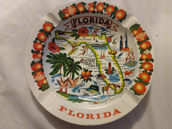 Pre-owned, vintage metal Ashtray and Florida souvenir. Graphics are sharp and brightly colorful. Cash price $10.00 Please bring exact change.