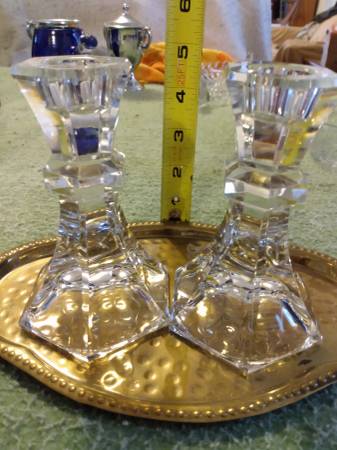 Pre-owned pair of 4" tall Candlestick Holders made of 24% lead crystal. It has nice light reflecting qualities. No damage. Tray not included. Cash Price USD $24.00 Please bring exact change. Thank...
