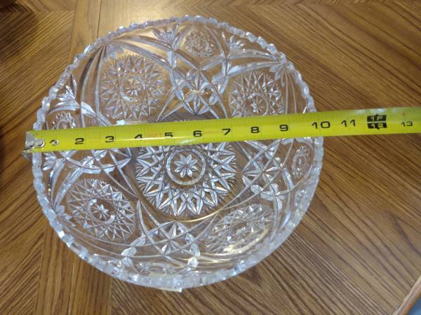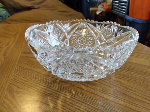 Pre-owned, vintage, decorative round Bowl 24% Lead Crystal with uneven sawtooth rim. Heavy and very light reflective. No chips. Cash price $47.00 Please bring exact change. Thank you.
