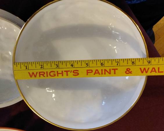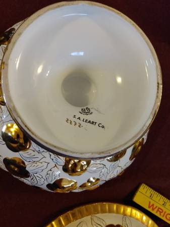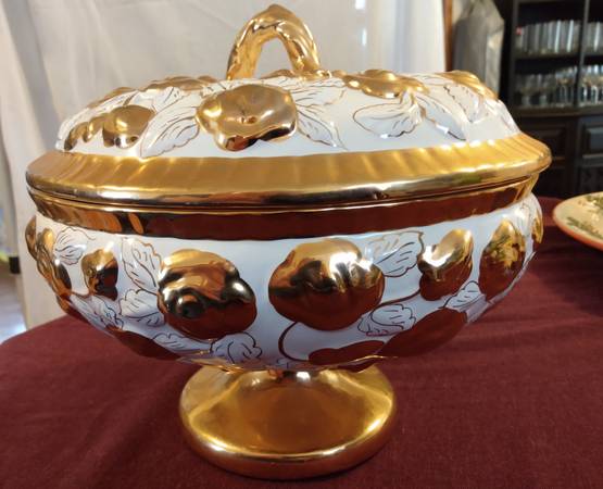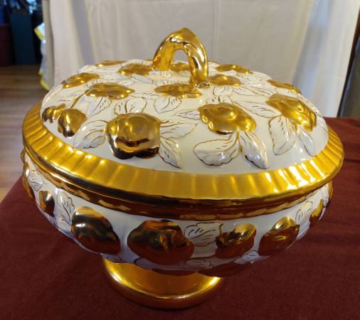 Pre-owned, vintage, 2 piece hand-painted gilt and white porcelain Bowl with gold handled lid and trim, along with gold pedestal footing. It has raised embossed gold flowers and raised leaf designs. This is a beautiful, showy, decorative cabinet piece.