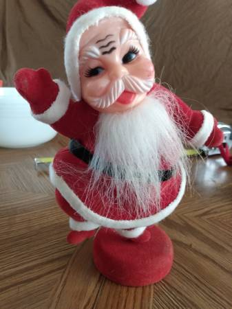 Pre-owned, vintage Christmas decoration of Santa Claus Dancing and Waving. It's made of plastic and flocked velvet. It does have some signs of wear to the flock but not too bad; as shown in pictures.
