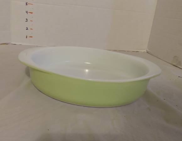 Pre-owned vintage Pyrex Bakeware , round with handles. Outer color is lime green and inside is white. Some signs of age but overall in good shape. Cash price $30.00 Please bring exact change. Thank...